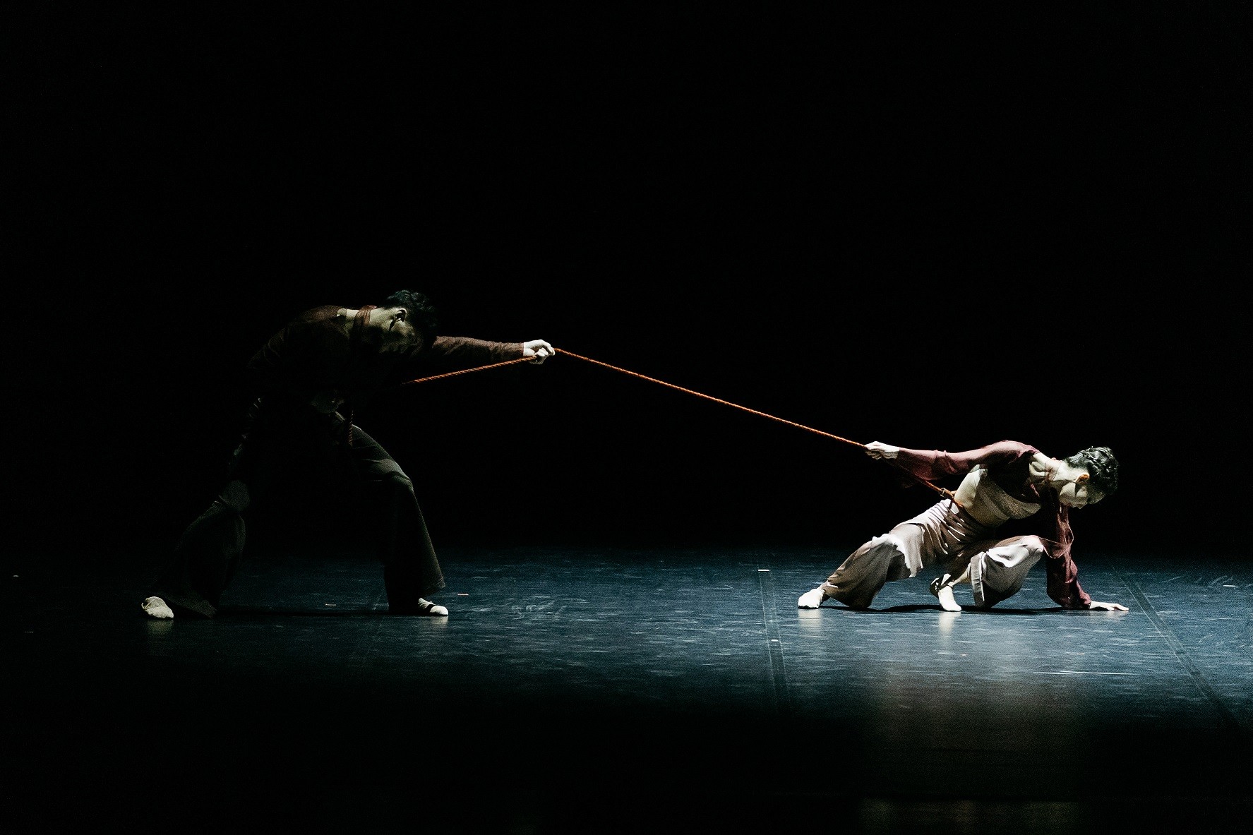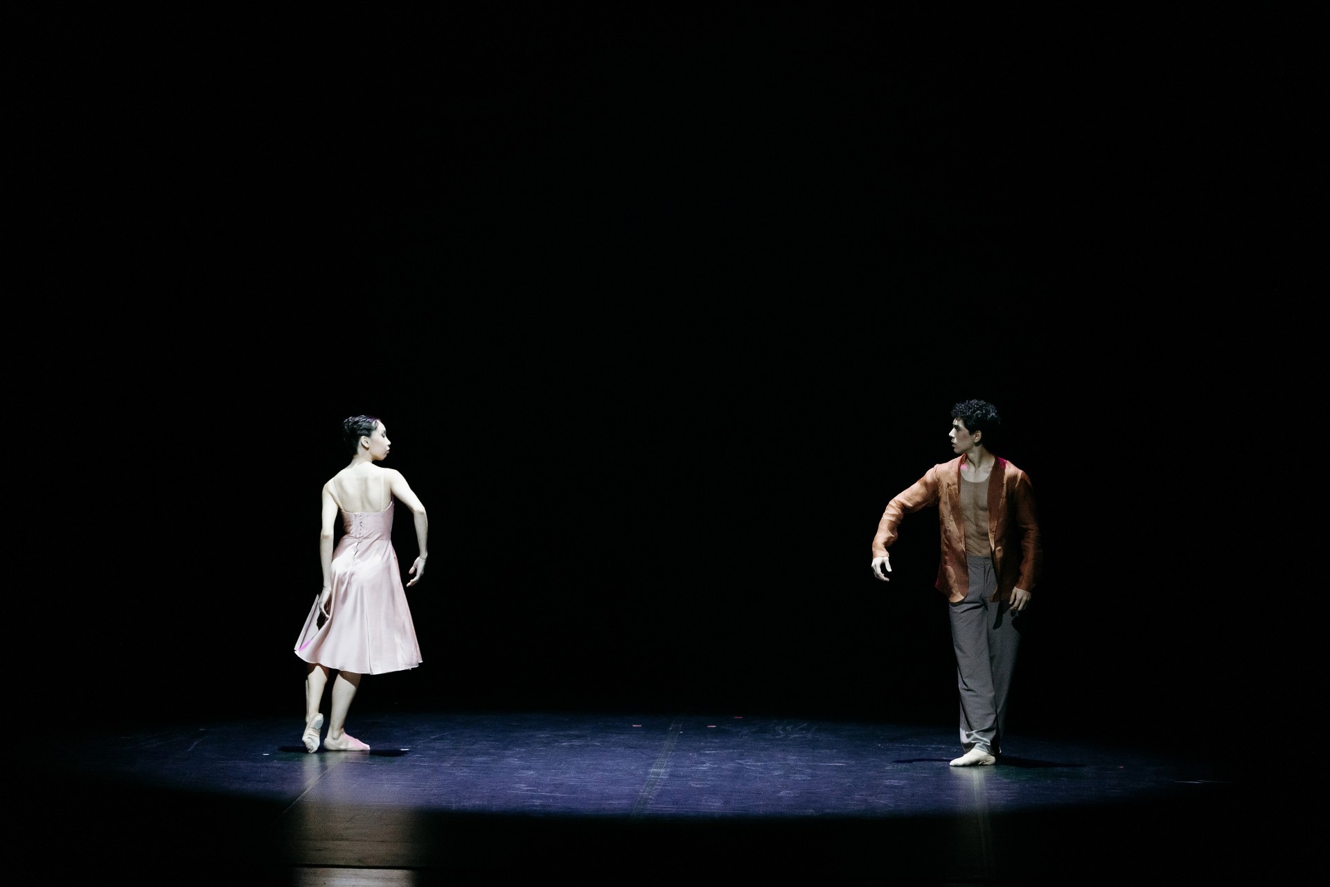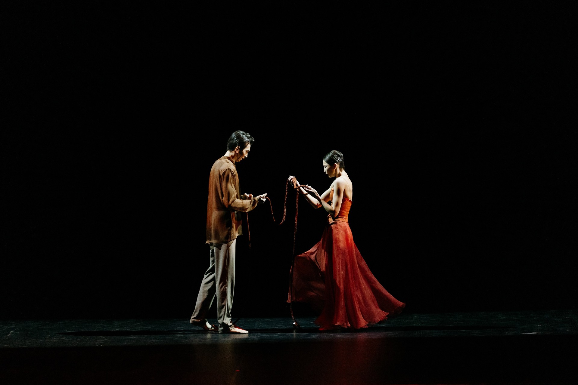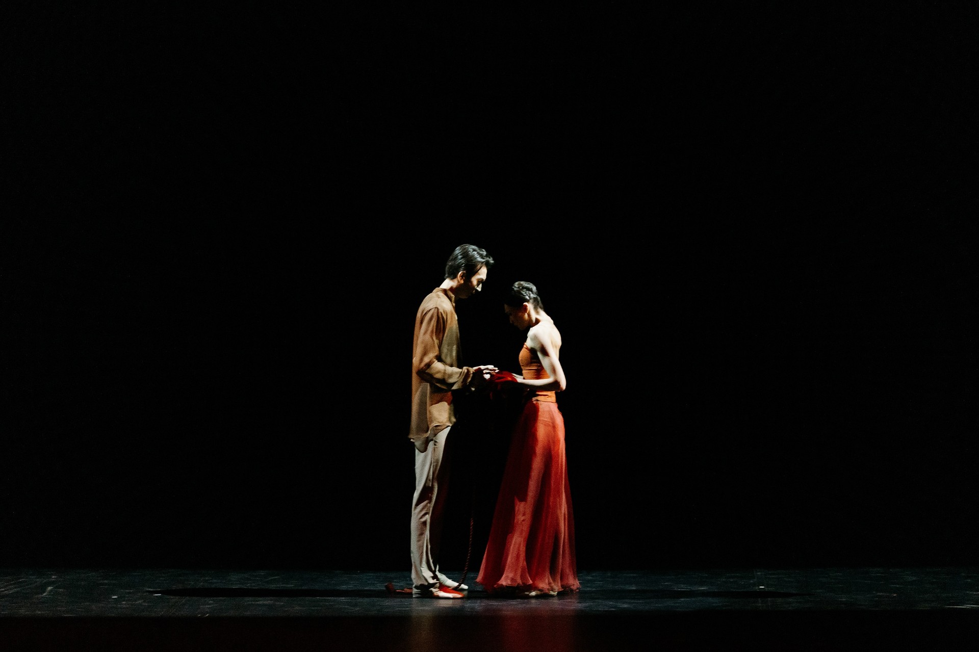 Первый этап – «Влюбленность» - увлек зрителей в самые чистые и нежные моменты чувства. Безмолвный диалог артистов Камиллы Ормановой и Досхана Зайдина, держащего в руках цветок, передал трепет первой любви. На этапе «Иллюзия любви / Страсть» тонкая нить, использованная хореографом-постановщиком в качестве главного символа, не только соединяла танцовщиков, но и наглядно подчеркивала незримое притяжение между ними. Тоску влюбленных друг по другу мастерски передали через удивительную пластику тела София Адильханова и Ислам Кайпбай. В эпизоде «Борьба» в исполнении Лимары Айдаровой и Галымжана Нурмухамета сквозь физическую схватку героев можно было различить крик их душ. Экспрессивные движения в стиле contemporary и декоративное решение (аркан) позволили в полной мере раскрыть внутреннюю драму героев. Дуэт Заслуженного деятеля Казахстана Айгерим Бекетаевой и Диаса Курмангазы в эпизоде «Принятие» стал моментом встречи двух рассудительных людей на вершине сознания, где любовь перерастает из ограничения в свободу. Легкие, почти невесомые, движения танцовщиков явили победу освобождения после борьбы, максимального принятия себя и другого. Кульминацией балета становится выход всех четырех пар, олицетворяющий триумф «Вечной любви».